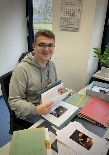 Frederic Dewald aus Oelde arbeitet nach seinem Abitur 2023 seit letztem Herbst im Kreisarchiv, um sich beruflich zu orientieren. Neben der Ordnung und Erschließung historischer Unterlagen liegt ein Schwerpunkt der vielseitigen Aufgaben in der Öffentlichkeitsarbeit.