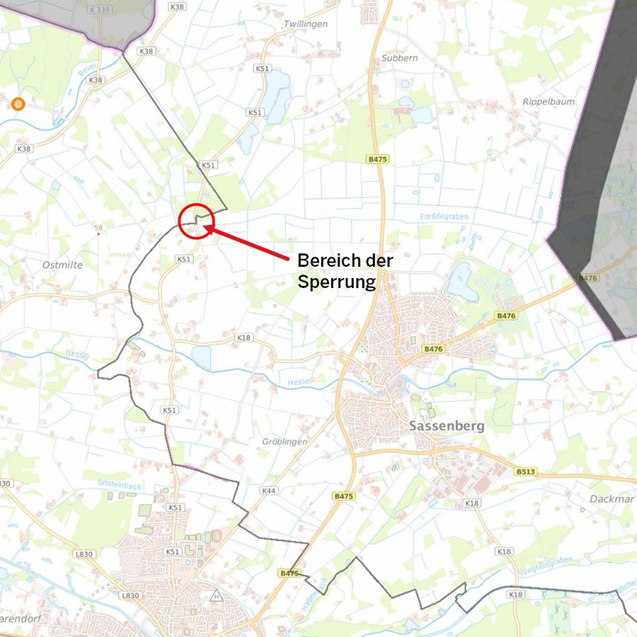 Für die Durchführung der Maßnahme ist es unvermeidlich die Kreisstraße für den Straßenverkehr komplett zu sperren. Eine Umleitung wird über die Kreisstraße 18 und die B 475 nach Füchtorf und umgekehrt eingerichtet.