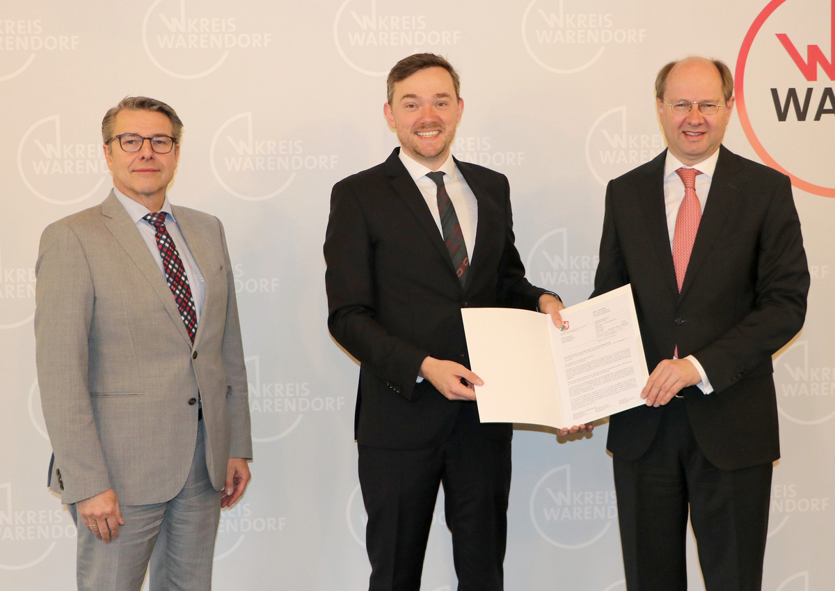 „Die finanzielle Situation der Stadt Warendorf ist wie in vielen Städten und Gemeinden angesichts der enormen Herausforderungen für die Kommunen schwieriger geworden. Allein die Unterbringung der vielen Flüchtlinge, Tarifsteigerungen im öffentlichen Dienst und nötige Investitionen setzen die Haushalte unter Druck. Die Kommunen brauchen in dieser Situation mehr Unterstützung von Bund und Land“, erklärt Landrat Dr. Olaf Gericke bei der Übergabe der Haushaltsverfügung an Bürgermeister Peter Horstmann.