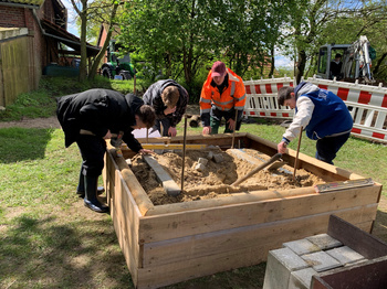 Überall sind konzentrierte und interessierte Gesichter zu sehen und sowohl die Schülerinnen und Schüler als auch die Lehrkräfte geben durchweg positive Rückmeldungen. Der Emshof als BNE-Regionalzentrum für den Kreis Warendorf (BNE = Bildung für Nachhaltige Entwicklung) bietet sich für diese Projektwoche an. Sie wurde in Kooperation mit der Kommunalen Koordinierungsstelle im Übergang Schule – Beruf im Kreis Warendorf organisiert und soll vor allem praktische Erfahrungen ermöglichen. „Ein Tag vor Ort mit den Händen in der Erde ist sehr viel anschaulicher und nützlicher für den Berufswahlprozess als jede Theorie“, erklärt Thomas Mosebach, Leiter des Emshofs. Besonders beliebt ist der Bagger, mit dem ohne körperliche Anstrengung mit Hilfe von zwei Joysticks viel Erde bewegt werden kann.