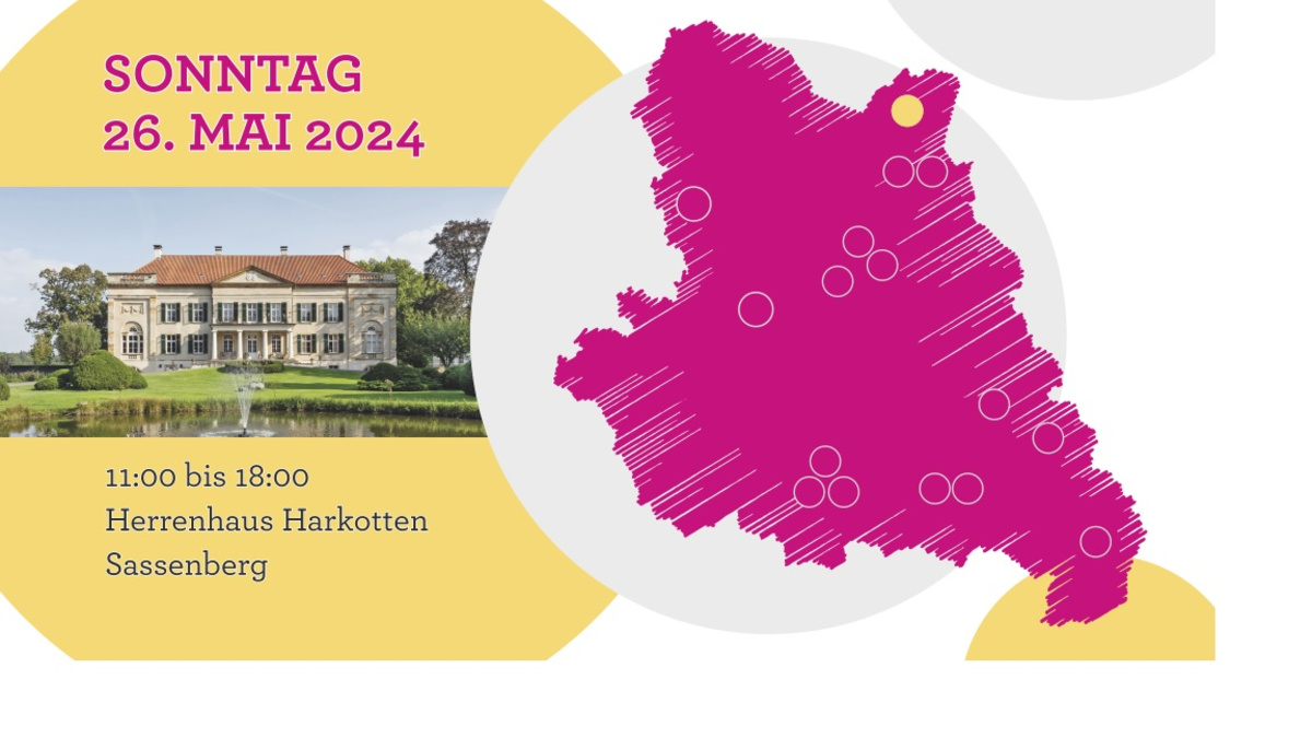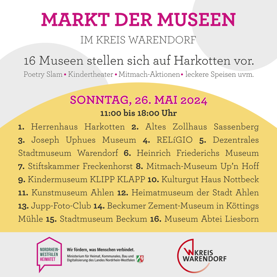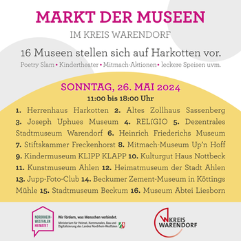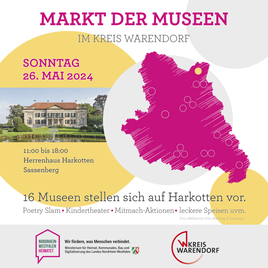 Am Sonntag, 26. Mai stellen sich erstmals 16 Museen aus dem Kreis Warendorf beim „Markt der Museen“ auf dem Gelände des Herrenhauses Harkotten (Harkotten 2, 48336 Sassenberg) vor. Ein vielseitiges Programm lädt an diesem Tag von 11 bis 18 Uhr bei kreativen und kulinarischen Angeboten, Musik und Unterhaltung zum Verweilen ein.