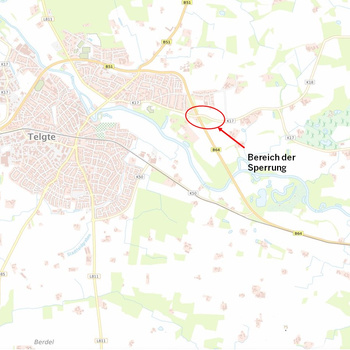 Für die Sanierung der Brücke über die B64 im Bereich der Alten Rennbahn (K17 / Einener Straße) in Telgte wurde für den Zeitraum vom 11.11.24 bis zum 22.11.24 eine Vollsperrung eingerichtet.