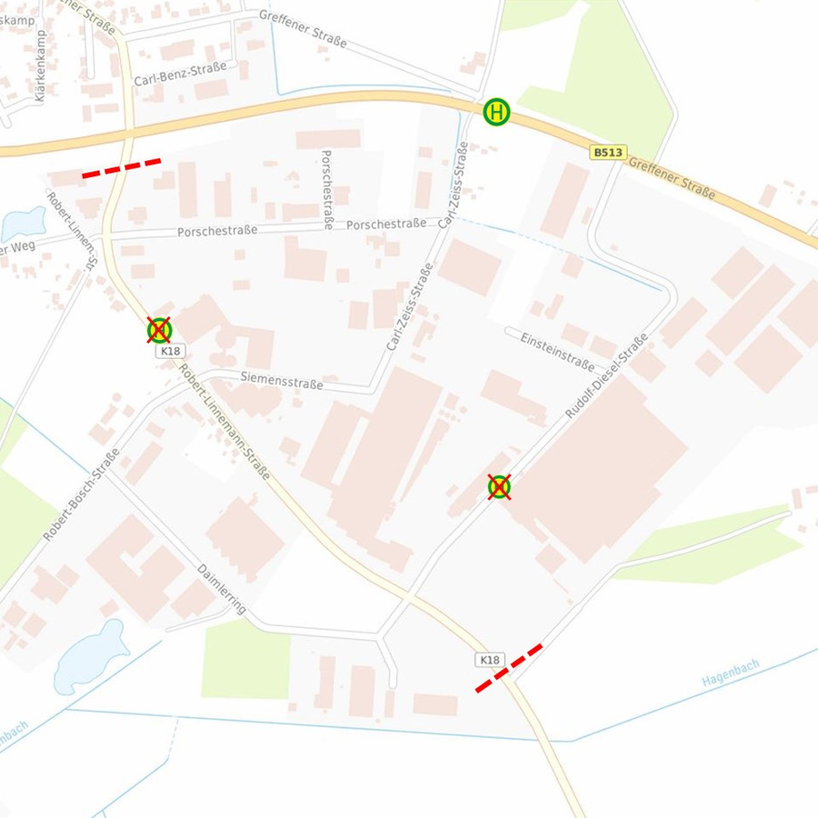 Der öffentliche Nahverkehr ist ebenfalls betroffen, da die Haltestellen „Technotrans“ und „LMC Caravan“ während der Bauphase nicht bedient werden können. Als Ersatz wird die Haltestelle „Carl-Zeiss-Straße“ auf der B 513 (Greffener Straße) angefahren.