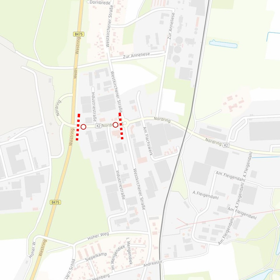 Es handelt sich um den rund 150 m langen Abschnitt zwischen der B 475 (Westring) und dem Kreisverkehr Nordring/Westkirchener Straße.