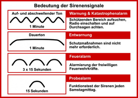 Jeden ersten Samstag im Monat findet der kreisweite Warntag statt. Dabei werden die über 80 stationären Sirenen im Kreis getestet. Immer um 10.45 Uhr wird für eine Minute der Signalton „Entwarnung“ (1-minütiger Dauerton) zu hören sein. Was die anderen Signaltöne bedeuten, können Sie dem Schaubild rechts entnehmen. Bei Sirenenalarm gilt jedoch grundsätzlich: Zuerst RadioWAF einschalten! Dort können Sie sich über den Grund der Alarmierung informieren und erhalten weitere Informationen und Hinweise zum richtigen Verhalten. Als Ergänzung zur Sirenenwarnung hat die Leitstelle des Kreises die Möglichkeit, das aktuelle Programm von RadioWAF zu unterbrechen und Durchsagen zur gegenwärtigen Gefahr und zum richtigen Verhalten abzusetzen.