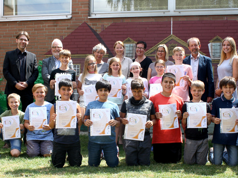 14 Jungen und Mädchen aus der Offenen Ganztagsschule (OGS) der Kardinal-von-Galen-Grundschule in Drensteinfurt haben vier Jahre lang am Bewegungsprojekt „Flic Flac Kids“ teilgenommen. Im Rahmen des Sommerfestes überreichte Schulleiter Norbert Bolz den Kindern ihre Urkunden. Die OGS-Kinder haben in einer vierjährigen Modellphase eine zusätzliche Bewegungsstunde nach einem Bewegungskonzept des Kreissportbundes Warendorf erhalten.