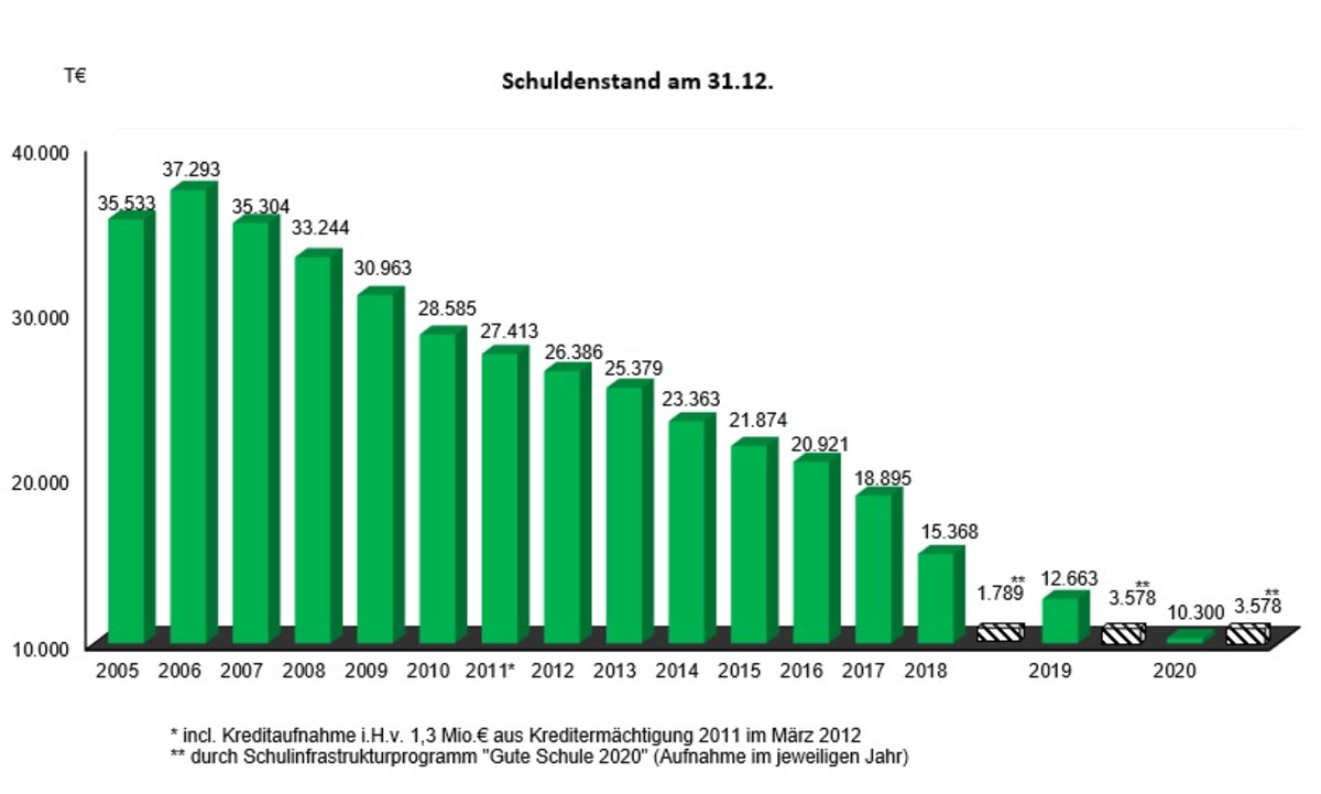 Für die Nachhaltigkeit des Verwaltungshandelns und der damit verbundenen intergenerativen Gerechtigkeit ist der kontinuierliche Schuldenabbau ein wesentliches Instrument zur Finanzpolitik. In den vergangenen Jahren wurde der Schuldenstand kontinuierlich abgebaut und mit ihm auch die Zinsbelastung des Kreises verringert. Betrug die Zinslast im Jahr 2006 noch rd. 1,8 Mio. €, so hat sich die Zinsbelastung durch die kontinuierliche Entschuldung im Haushaltsplan 2020 auf 340 T€ reduziert. Der Finanzausschuss hat am 06.03.2020 einen überplanmäßigen Schuldenabbau im Haushaltsjahr 2020 beschlossen und somit konnten in 2020 Investitionskredite i. H. v. 4,83 Mio. € vorzeitig abgelöst werden. Der Schuldenstand liegt Ende 2020 somit bei rund 6 Mio. €, im Vergleich zu 2006 eine Verminderung um gut 80 %. Der Prozess eines Schuldenabbaus soll auch in Zukunft fortgesetzt werden.