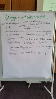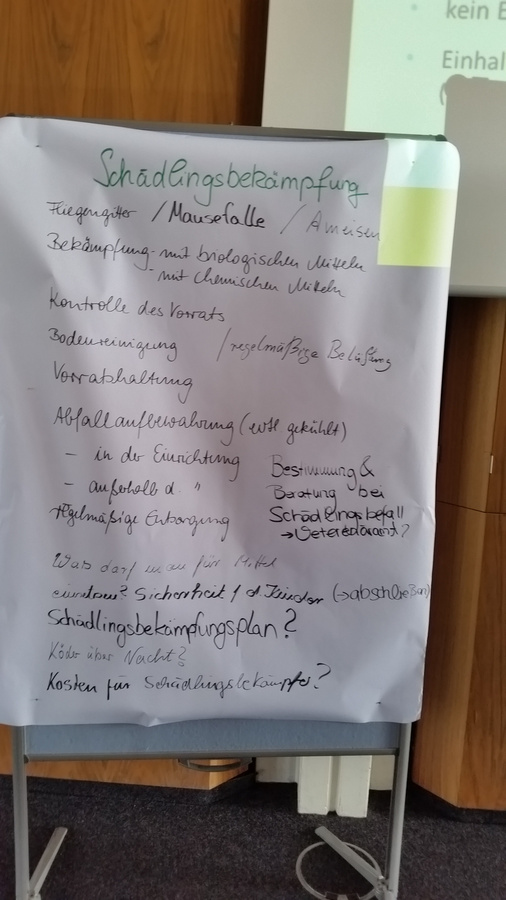 Am Nachmittag des Fachtages erfolgte gemeinsam mit den Teilnehmerinnen und Teilnehmern eine inhaltliche Vertiefung der Aspekte des Hygienemanagements. Was muss beachtet werden, wenn zum Beispiel Speisen von zuhause in die Kita bzw. Schule mitgebracht werden? Außerdem wurde über die Hygienevorschriften bei der Mitwirkung von Kindern und Eltern bei der Speisenzubereitung oder bei pädagogischen Aktionen zum Thema Ernährung informiert.