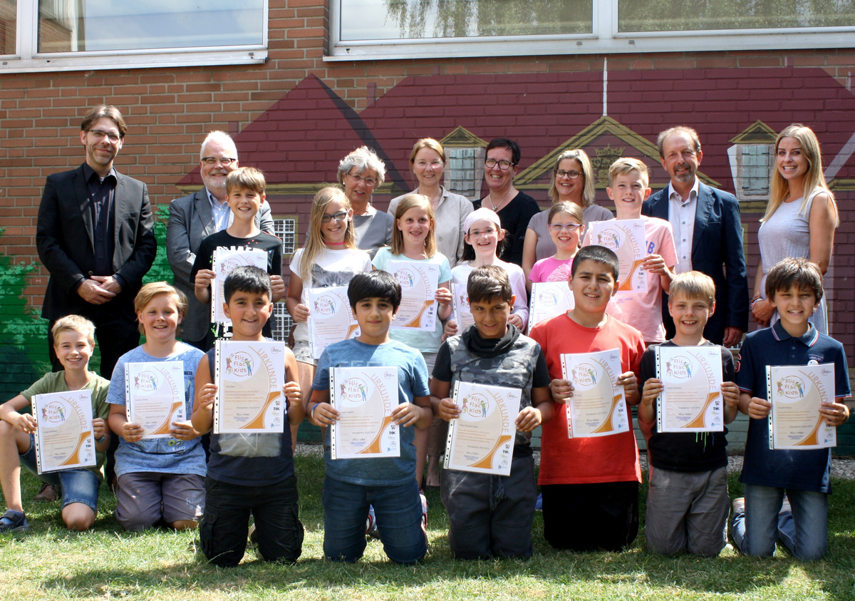 14 Jungen und Mädchen aus der Offenen Ganztagsschule (OGS) der Kardinal-von-Galen-Grundschule in Drensteinfurt haben vier Jahre lang am Bewegungsprojekt „Flic Flac Kids“ teilgenommen. Im Rahmen des Sommerfestes überreichte Schulleiter Norbert Bolz den Kindern ihre Urkunden. Die OGS-Kinder haben in einer vierjährigen Modellphase eine zusätzliche Bewegungsstunde nach einem Bewegungskonzept des Kreissportbundes Warendorf erhalten.