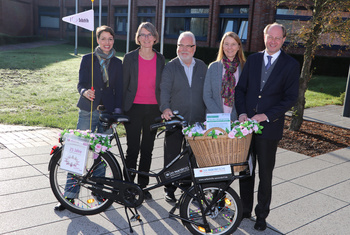 Ein auffällig dekoriertes Fahrrad wird in den nächsten vier Wochen im Eingangsbereich des Kreishauses auf die Selbsthilfeangebote im Kreis Warendorf aufmerksam machen. Es wurde von Mitarbeiterinnen der Selbsthilfe-Kontaktstelle zusammen mit Aktiven aus der Selbsthilfe im Kreis gestaltet. Am Gepäckträger befinden sich Prospekthalter mit vielen Informationen über die Selbsthilfe im Kreis Warendorf und die Arbeit der Kontaktstelle.