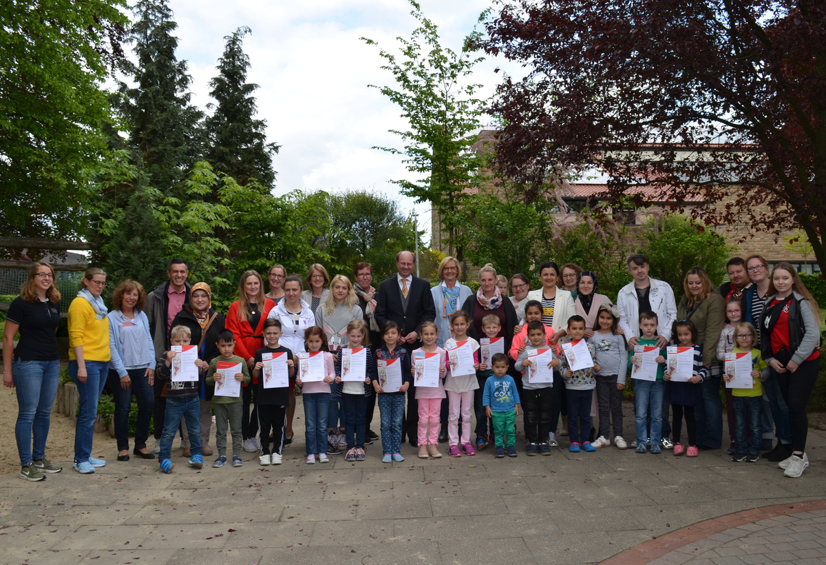 14 Jungen und Mädchen aus dem Familenzentrum Kita St. Ludgeri in Ahlen nehmen ein Jahr lang am Projekt „Kindergarten in Bewegung“ teil. Landrat Dr. Olaf Gericke überreichte den Kindern zur Ergänzung des Angebots sogenannte Schnuppergutscheine. Damit können sie sechs Monate lang kostenlos Sportangebote in den örtlichen Sportvereinen nutzen oder Schwimmkurse besuchen. In diesem Zeitraum übernimmt das Kreisgesundheitsamt die Mitgliedsbeiträge. Auf diese Weise sollen die Schnuppergutscheine dazu beitragen, Kindern den Zugang in einen Sportverein zu erleichtern.
