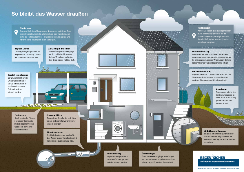 Insbesondere rund ums eigene Haus lassen sich viele Vorkehrungen treffen. So bleibt das Wasser draußen. Zum Download.