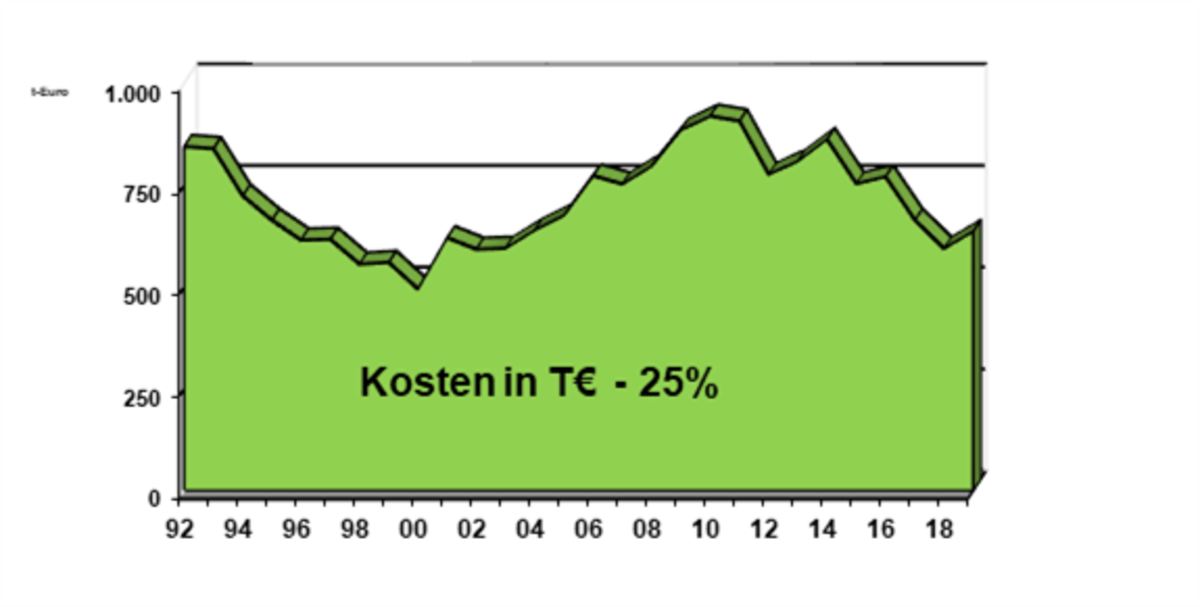 Auch die Gesamtenergiekosten konnten über die Jahre um 25% gesenkt werden, trotz steigender Energiekosten. Hier zeigen die zahlreichen Maßnahmen zur Energie- Einsparung und CO2- Reduktion ihre Wirkung.