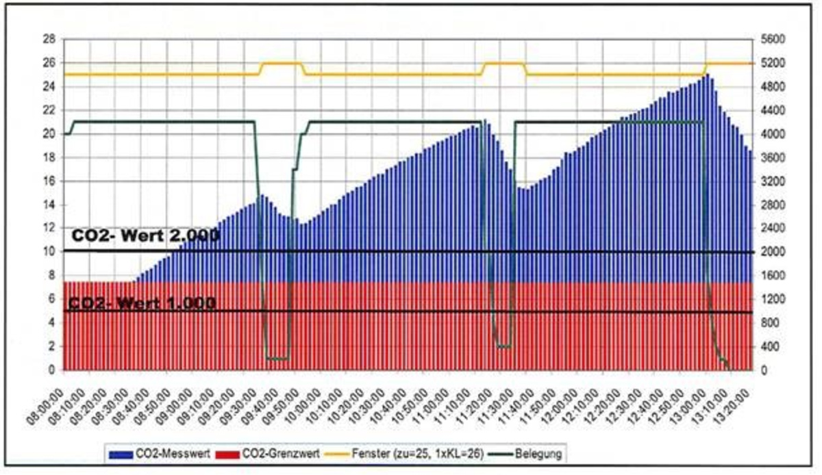 Die Grafik zeigt den Verlauf der CO2-Raumluftkonzentration über 6 Schulstunden mit zwei Pausen und Fensterlüftung in den Pausen. Auch regelmäßiges Lüften durch Öffnen der Fenster in den Pausen bringt nur unbefriedigende Ergebnisse. In den Raum aufschlagende Fensterflügel stellen zudem nach den aktuellen Richtlinien eine Unfallgefahr dar. Die neuen Fenster sind im geschlossenen Zustand bauartbedingt deutlich luftdichter als die Bestandsfenster und vermindern den natürlichen Luftwechsel über Fugenundichtigkeiten.