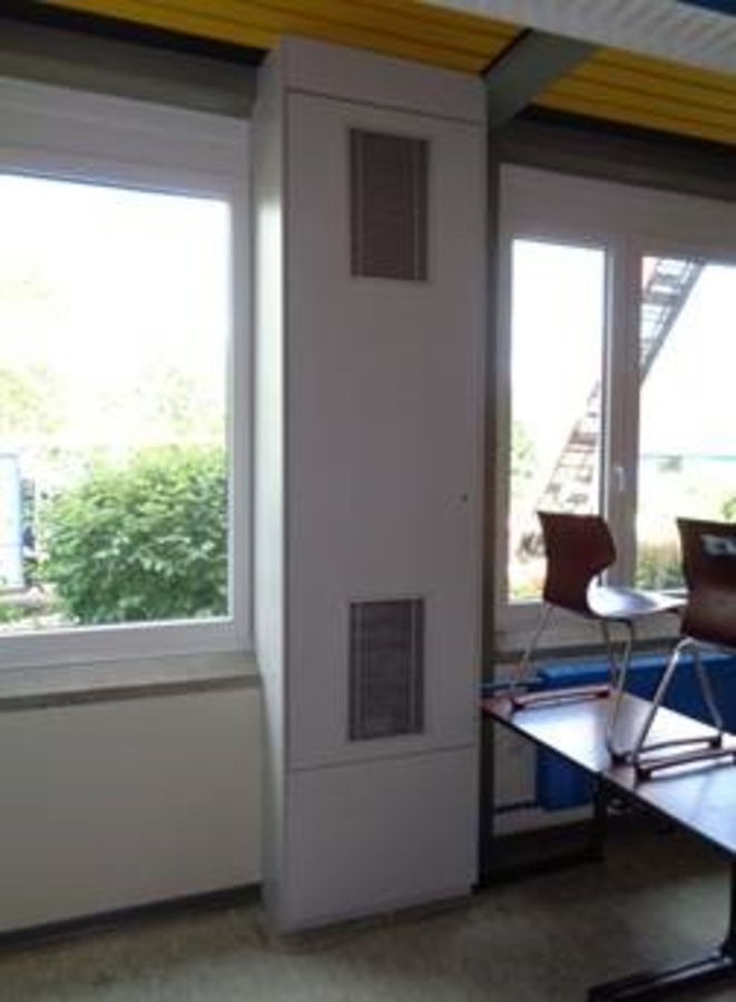 Die neue energieeffiziente Lüftungstechnik in den Klassenräumen vermeidet unkontrollierte Wärmeverluste durch geöffnete Fenster. Die Abluft aus dem Raum wird über einen Wärmetauscher geführt und erwärmt die Zuluft für den Klassenraum.
