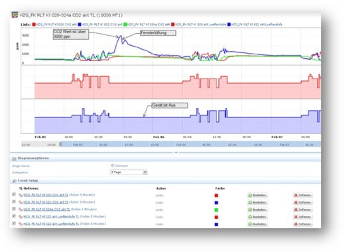 Das Diagramm zeigt typische CO2-Konzentrationen über 2 Schultage. Am Nachmittag des ersten Tages war das Gerät nicht eingeschaltet. Trotz Fensterlüftung wurde ein Wert von 3.000 ppm in der Raumluft gemessen.