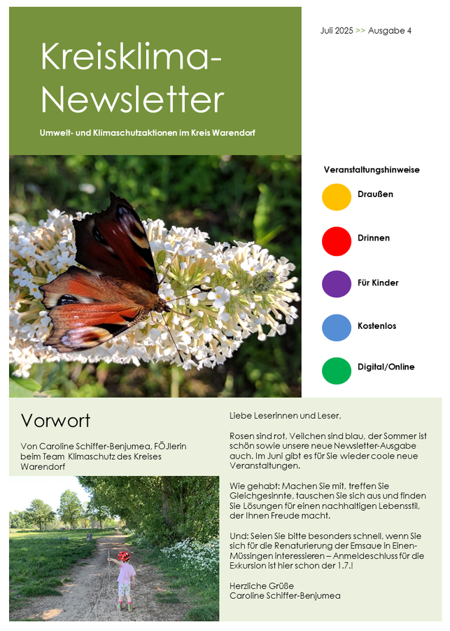 Der Kreis Warendorf übernimmt Verantwortung und hat den politischen Beschluss gefasst, bis 2040 klimaneutral zu werden. Um dieses Ziel zu erreichen, setzt der Kreis Warendorf zahlreiche Maßnahmen selbst um und unterstützt die kreisangehörigen Kommunen, Unternehmen und Bürgerinnen und Bürger auf dem Weg zur Klimaneutralität. Zudem unterstützt der Kreis Warendorf aktiv die regionale Initiative "Münsterland ist Klimaland".